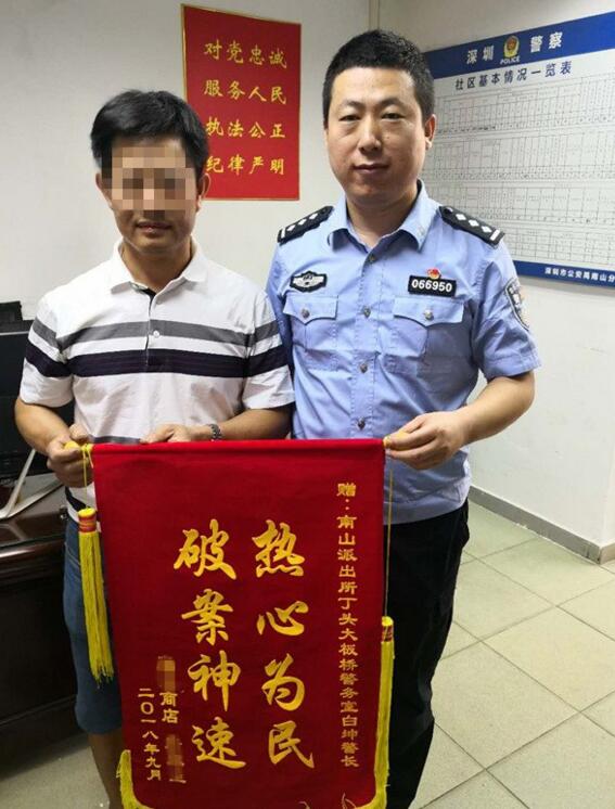 9月12日下午,事主唐先生親自帶著一面寫有"破案神速,熱心為民"的錦旗到丁頭大板橋警務(wù)室,對南山派出所丁頭社區(qū)民警及巡防員及時為其找回被盜手機表示感謝和贊揚。(記者 羅典 通訊員 龍威 唐婷)