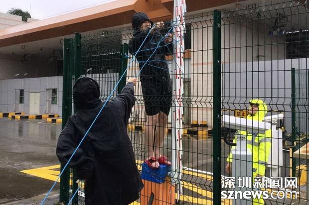 邊檢技術(shù)民警冒雨在搶修被強臺風(fēng)損毀的車道閘桿