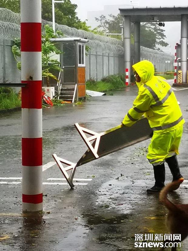 邊檢民警冒雨在拾取被強臺風(fēng)掀倒現(xiàn)場通關(guān)標識牌