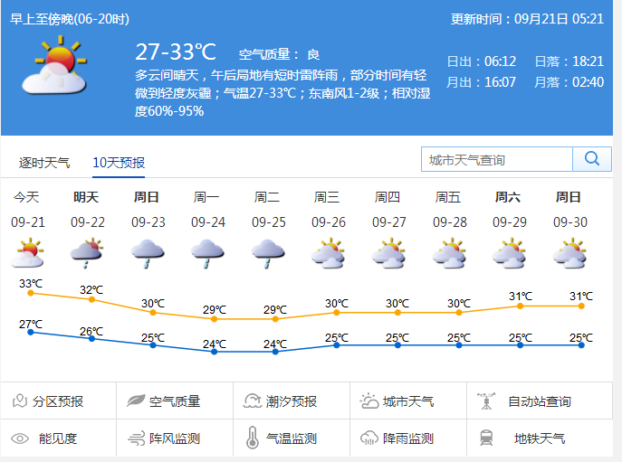 深圳市氣象臺(tái)提醒,21日深圳天氣炎熱,請(qǐng)注意做好防暑降溫;部分時(shí)間有輕微灰霾,建議根據(jù)灰霾條件合理安排戶外活動(dòng)。此外,中秋假期出行或有陣雨,注意攜帶雨具。