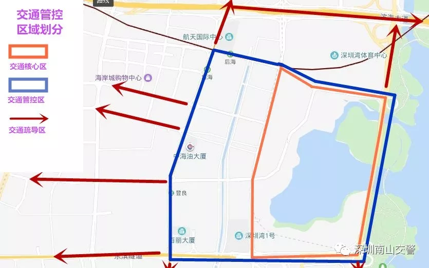 交通管理區(qū)外圍相應(yīng)的濱海大道、科苑南路(濱海以北段)、沙河西路(濱海以北段)、海德三道(后海濱以西段)、登良路(后海濱以西段)、創(chuàng)業(yè)路(后海濱以西段)、后海濱路、望海路等道路。