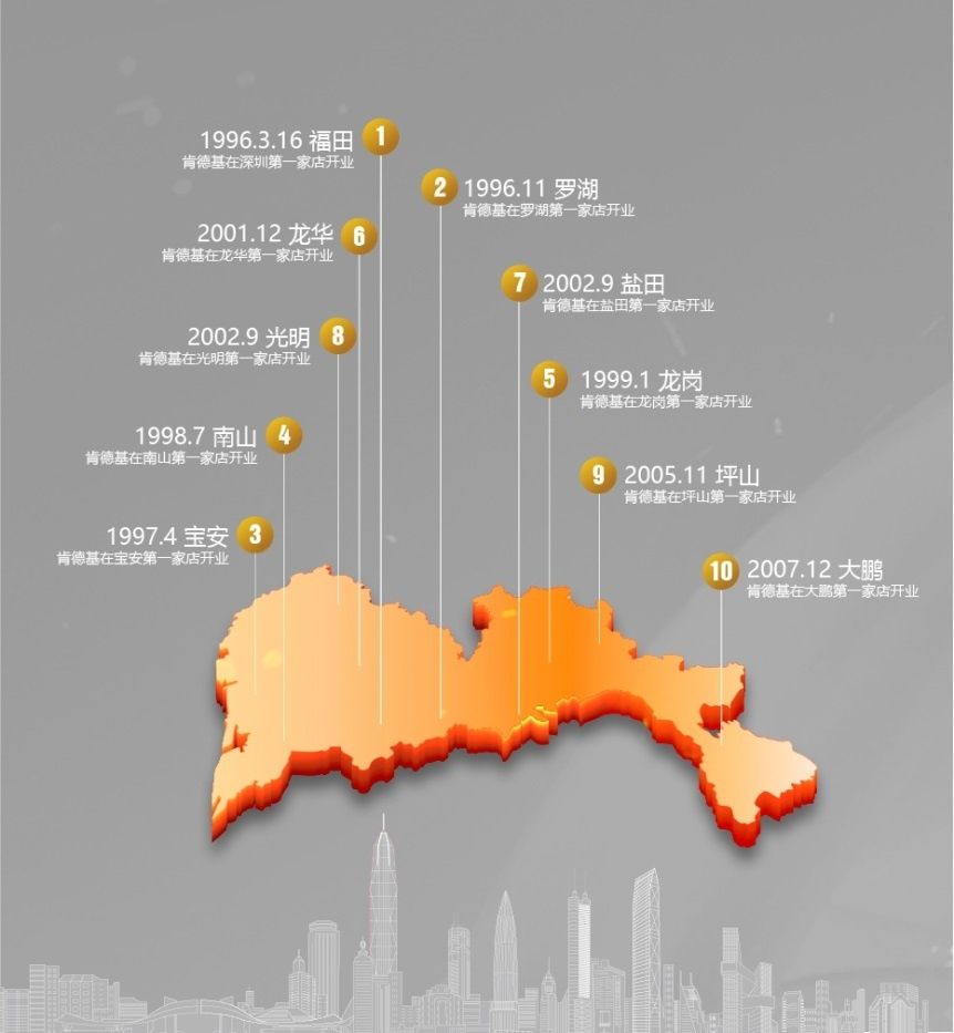 2007年,是深圳的大年份,也是肯德基的大年份。2007年,深圳人均GDP達到10684美元,首次超過1萬美元??系禄拈_店數(shù)量也在那一年突破了100家,達到108家。同時,肯德基完成了對現(xiàn)在深圳十區(qū)的開店布局。