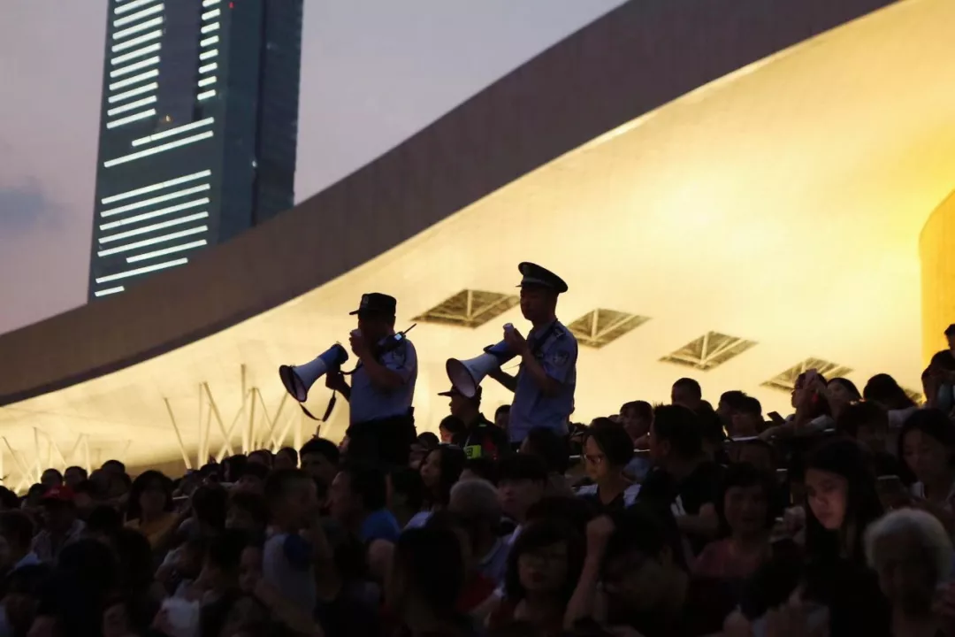 燈光秀表演持續(xù)時間長,參加安保工作的警力從17點(diǎn)到23點(diǎn)的6個小時里,始終處于工作狀態(tài),由于人流量每天都近20萬人次,工作強(qiáng)度之大難以想象,但他們毫無怨言堅守崗位,一刻不停地穿梭于人群中,民警和隊員用人墻隔離出一條條通道,身挎大喇叭,全力疏散引導(dǎo),維護(hù)現(xiàn)場秩序。在各個出入口、疏散通道、地鐵口、公交站臺等人流密集點(diǎn)都能看到他們忙碌的身影。