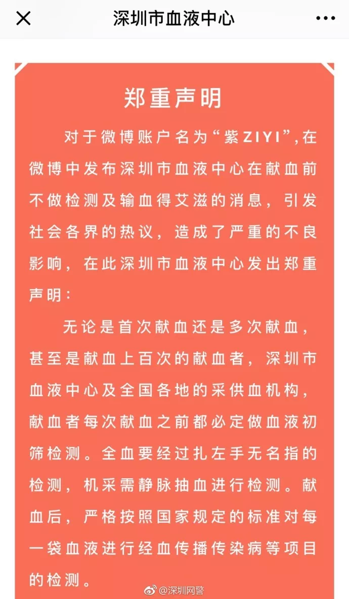日前,微博名為“紫ZIYI”網友聲稱其在深圳獻血未做血液檢查。