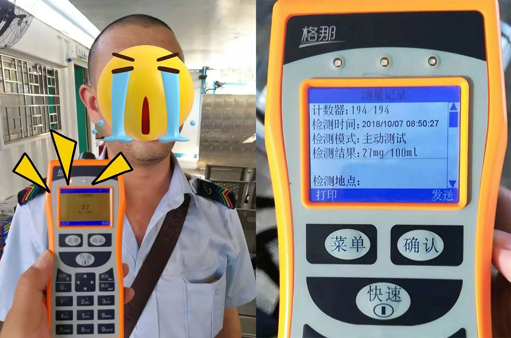 何某平告訴民警,自己是在前一天8點(diǎn)多吃晚飯時(shí)喝了二兩白酒,第二天早上覺得自己應(yīng)該“醒酒”了,就照常上班。沒想到隔夜酒還未退散。