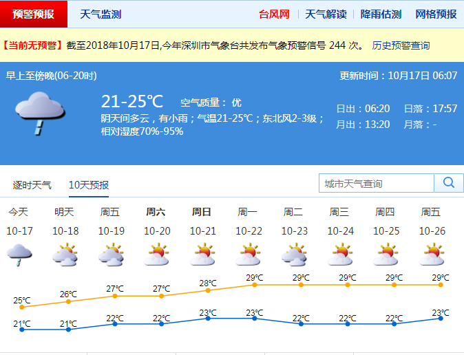 市氣象局預(yù)計(jì),17日深圳市以陰天間多云為主,有小雨,氣溫21-25℃,空氣漸趨干燥,其中18-20日沿海和高地有6-7級偏東風(fēng)。