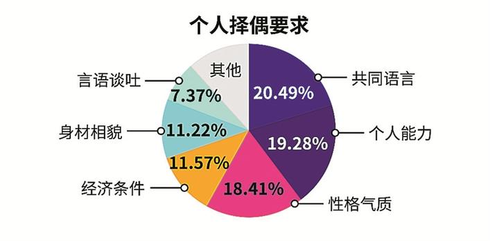 調(diào)查顯示,共同語言、個人能力、性格氣質(zhì)為單身男女在擇偶時最看重的三個方面,其次為經(jīng)濟條件、身材相貌、言語談吐。可見,相較于過去條件上的匹配,更重視精神上的契合。