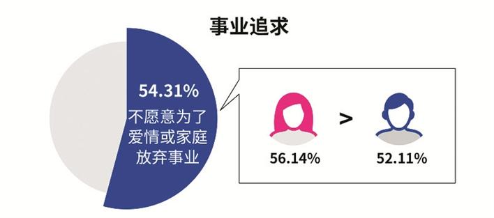 對于許多人而言,愛情和事業(yè)沖突的抉擇已經(jīng)越來越常見。調(diào)查顯示,54.31%的單身男女不愿意為了愛情或家庭放棄自己的事業(yè)。從男女差異看,56.14%的女性表示不愿意為了愛情或家庭放棄自己的職場或事業(yè),高于男性??梢姡詫τ谑聵I(yè)的追求正在逐漸提升。