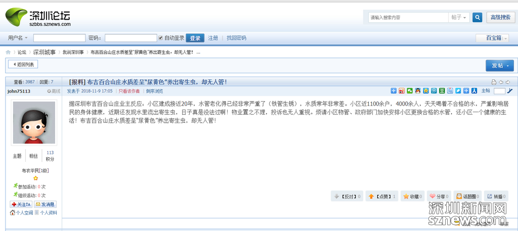 深圳新聞網(wǎng)11月12日訊 (記者劉婷)“布吉百合山莊水質(zhì)差呈‘尿黃色’養(yǎng)出寄生蟲,卻無人管!”,近日網(wǎng)友在深圳論壇上發(fā)帖曝料龍崗布吉百合山莊水質(zhì)差,引發(fā)網(wǎng)友廣泛關(guān)注。(網(wǎng)帖地址:https://szbbs.sznews.com/thread-3817358-1-1.html)