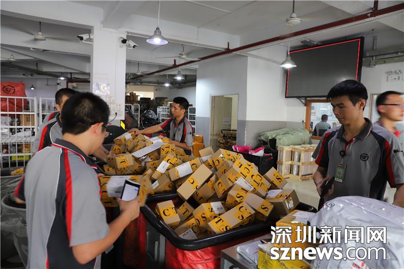 在田貝營運(yùn)部內(nèi),順豐員工使用手機(jī)掃碼后快速分揀快遞