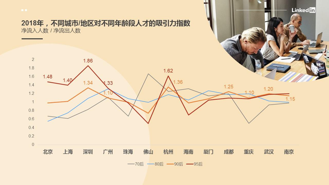在此前的調(diào)研中,領英數(shù)據(jù)顯示90/95后年輕職場人的平均在職時間顯著降低,為了追求更好的工作機會他們不介意頻繁跳槽。而這樣的高流動性同樣也體現(xiàn)在城市的變動上。以職場人總工作年限/所有生活工作過的城市數(shù)量為衡量依據(jù),領英大數(shù)據(jù)顯示:職場人城市間流動頻率,呈現(xiàn)出隨年齡的降低而增高的趨勢,年輕一代在城市方面的流動性越來越強。