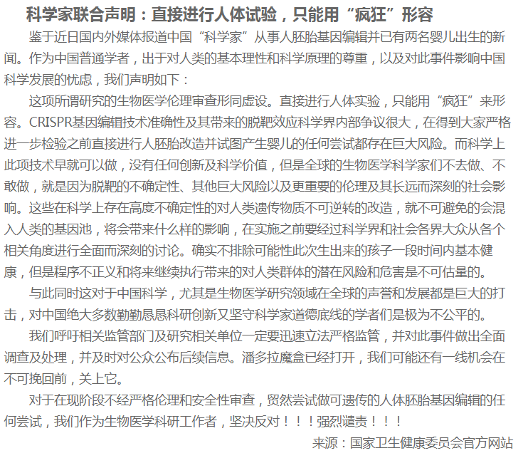 據(jù)了解,事情的起因是賀建奎在第二屆國(guó)際人類基因組編輯峰會(huì)召開前一天宣布,一對(duì)名為露露和娜娜的基因編輯嬰兒于11月在中國(guó)誕生。