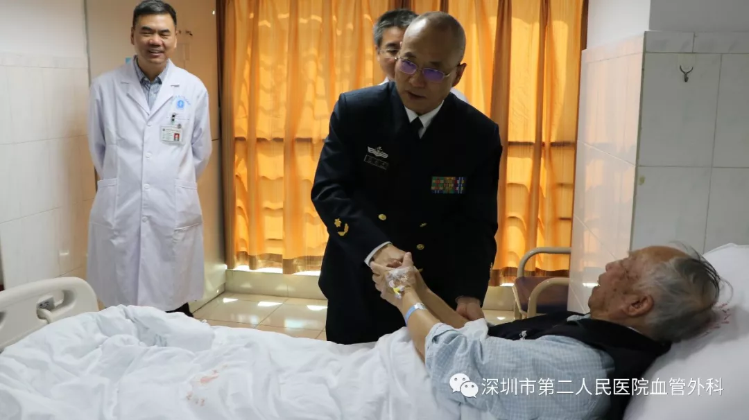 座談會結(jié)束后,景在平教授、趙永勝副院長與科室醫(yī)護(hù)人員一起,進(jìn)行了床邊臨床教學(xué)查房,同時為一位腹主動脈瘤疾病患者會診。患者是抗美援朝老英雄(享受軍級待遇),因發(fā)現(xiàn)腹主動脈瘤(俗稱“不定時炸彈”)后,一直深受該疾病困擾,一度不愿意接受治療。經(jīng)過景在平教授詳細(xì)講解后豁然開朗,同意接受治療,并要求在景在平教授團(tuán)隊及朱國獻(xiàn)主任團(tuán)隊下進(jìn)行手術(shù)治療。會診結(jié)束時,老先生緊緊握住景在平教授的手,萬分感激。