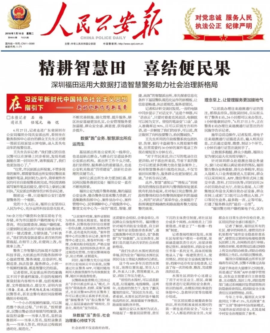 ★★進入新時代,福田公安用信息化手段不斷強化管理、創(chuàng)新服務(wù)、提升效能,一件事情接著一件事情辦,不斷滿足群眾最關(guān)心最直接最現(xiàn)實的需求,讓數(shù)據(jù)多跑腿、群眾少跑路,打通服務(wù)群眾的“最后一公里”。