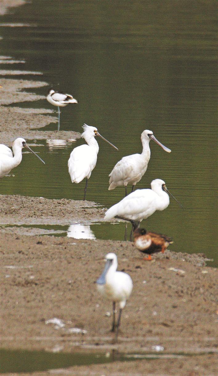 中午12時許,福田紅樹林國家級保護(hù)區(qū)的2號魚塘里,已經(jīng)聚集了45只珍稀候鳥——黑臉琵鷺。在它們身邊,還有數(shù)百只反嘴鷸、針尾鴨、綠翅鴨、琵嘴鴨、赤頸鴨、青腳鷸等候鳥在水中忙著覓食。