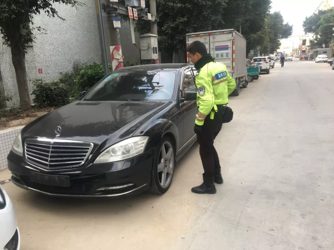 2018年12月28日下午17時左右,深圳交警鐵騎隊員巡邏至寶安沙井洋下大道附近的修理廠時,發(fā)現(xiàn)一輛黑色奔馳未懸掛號牌。