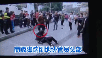 從目擊市民拍攝到的畫面看,一名身著市容執(zhí)法制服的城管隊(duì)員,被一名婦女扯住胸口、與其一塊倒地之際,另有一名光頭男子,抬腳對著城管隊(duì)員的頭猛踢了兩腳,城管隊(duì)員表情痛苦。