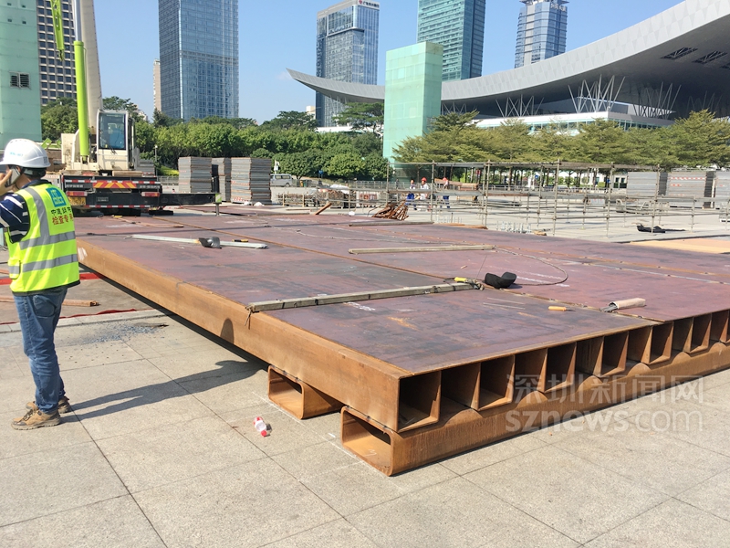 在市民中心南廣場搭建春晚深圳分會場舞臺,借助深圳燈光秀為背景,確實是一個絕佳的創(chuàng)意。要實現(xiàn)創(chuàng)意,搭建舞臺是關鍵一役。去過南廣場看燈光秀的深圳人應該知道,南廣場中間位置正好是地下車庫的玻璃采光棚,春晚主舞臺剛好就位于廣場玻璃采光棚的正上方。玻璃材質決定了它無法承受上部集中荷載,需要事先改變傳力路徑或對場地下部梁板進行加固處理,謝衛(wèi)兵和同事發(fā)現(xiàn),研究舞臺局部可操作性的加固方案迫在眉睫。
