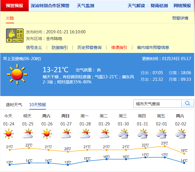 深圳新聞網(wǎng)1月24日訊 今日白天,深圳以晴天干燥天氣為主。早晨氣溫較低,最低氣溫徘徊在13 ℃左右,中午前后氣溫略有升高,最高氣溫在21 ℃左右。