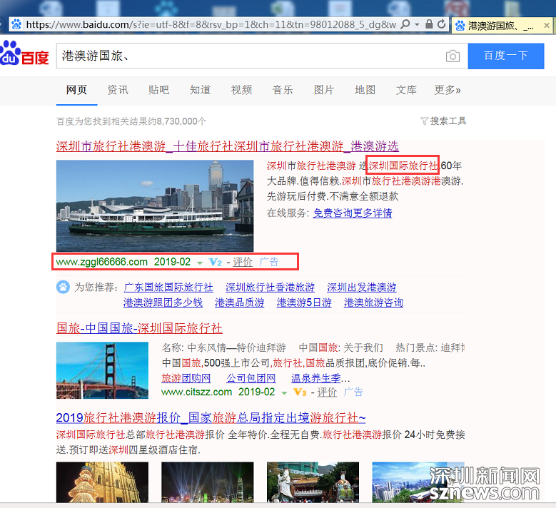 深圳市消委會模擬消費者網(wǎng)絡(luò)搜索實際使用場景,在百度搜索中搜索“港澳游國旅”等關(guān)鍵詞,進行了專項測試調(diào)查。調(diào)查發(fā)現(xiàn),搜素“港澳游國旅”等關(guān)鍵詞時搜索頁面會出現(xiàn)加V等級認證的旅行社廣告信息,但經(jīng)核實,“深圳信用網(wǎng)”商事主體登記信息中并無該企業(yè)。