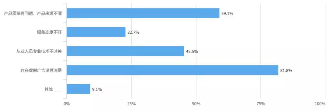 消費者們認為美容美發(fā)行業(yè)中存在最大的問題是虛假廣告誤導(dǎo)消費,第二則是產(chǎn)品質(zhì)量問題和產(chǎn)品來源不清。