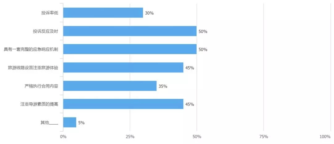 在眾多的旅游體驗當(dāng)中,消費者遇到的最主要的問題是強制購物、遭遇虛假宣傳、臨時更改旅游線路等問題,同時消費者在選擇旅游線路時,“野馬旅行社”、導(dǎo)游的服務(wù)態(tài)度、安全等問題也在重點考慮范圍內(nèi)。在改進旅行社服務(wù)質(zhì)量方面,80%的消費者認為現(xiàn)狀需要政府和網(wǎng)絡(luò)共同關(guān)注,才能營造良好的旅游環(huán)境。旅行社對于投訴案例的反應(yīng)機制和反應(yīng)速度,之后也將成為消費者在選擇旅行線路時的重要考量標準之一。