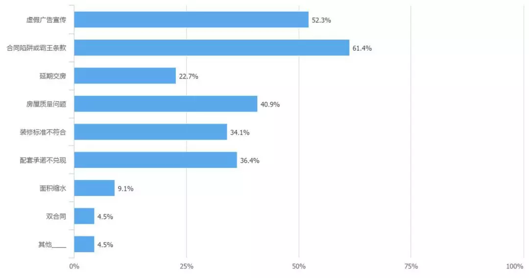 調(diào)查結(jié)果顯示,房產(chǎn)糾紛主要集中在購買一手房、二手房和房屋裝修上,分別占比38.6%、27.3%、27.3%,而且將近70%的消費者對房產(chǎn)交易過程中的相關(guān)知識和風(fēng)險只是了解一般。同時,消費者在新建商品房和二手房交易過程中遇到的糾紛在問卷結(jié)果中顯示都是多方面的。其中,新建商品房交易陷阱主要是“合同陷阱或霸王條款”、“虛假廣告宣傳”;二手房交易陷阱主要是“隱瞞房屋缺陷”。針對如何避免購房糾紛,50%以上的消費者認為“購房前咨詢朋友、專家”和“購房前多學(xué)習(xí)房產(chǎn)知識,防止受騙”是最好的辦法。