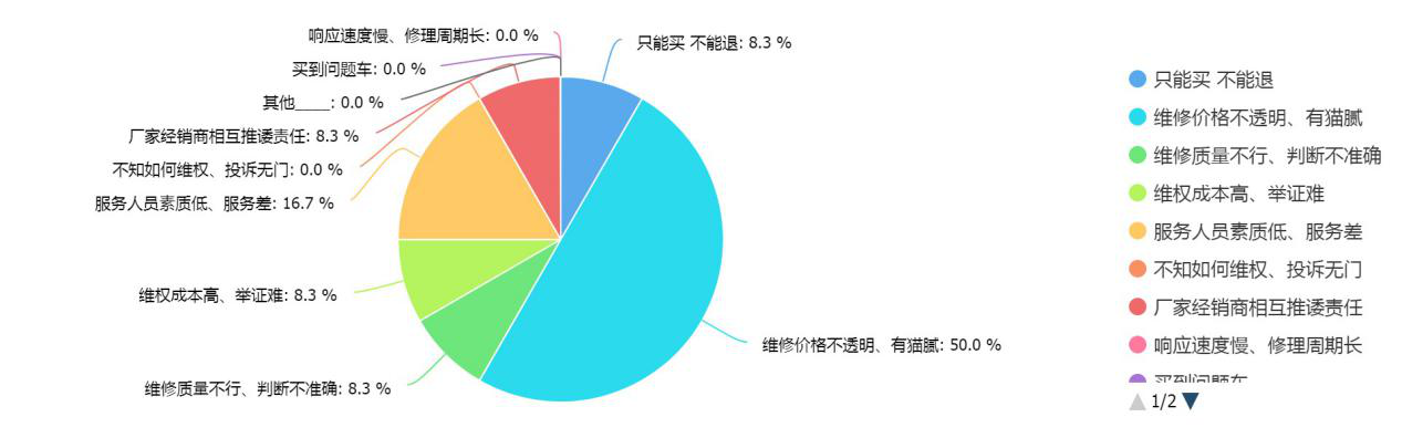 本次調查問卷顯示,網友覺得汽車質量問題集中在發(fā)動機和車身附件及電器,而在質量維修上,有50%的消費者認為維修價格不透明、有貓膩,維修保養(yǎng)服務令消費者最不滿意的部分則是久修不愈。