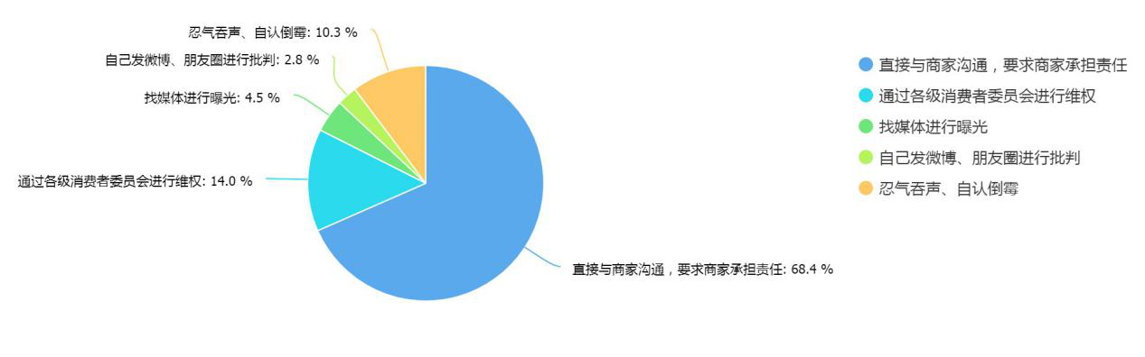 有68.4%的受訪者在遇到消費侵權后選擇直接與商家溝通,要求商家承擔責任,10.4%的受訪者會選擇忍氣吞聲、自認倒霉;其中男性消費者更傾向于找媒體曝光,而女性消費者則傾向于忍氣吞聲。