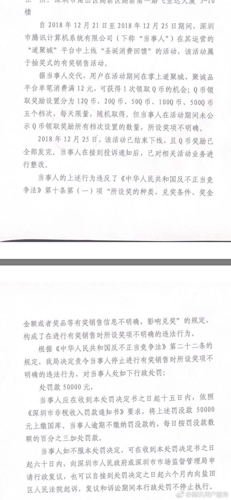 為解答網友疑惑,當天晚間,微博賬號騰訊用戶服務公開發(fā)布了該處罰決定書,決定書中提到,2018年12月21日 -25日期間,深圳市騰訊計算機系統(tǒng)有限公司(下稱"當事人")在其運營的"道聚城"平臺中上線"圣誕消費回饋"的活動,該活動屬于抽獎式的有獎銷售活動。