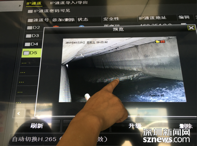工作人員向記者介紹淤泥淤積情況,監(jiān)控中顯示5米余高的暗渠只剩2米左右排水高度。