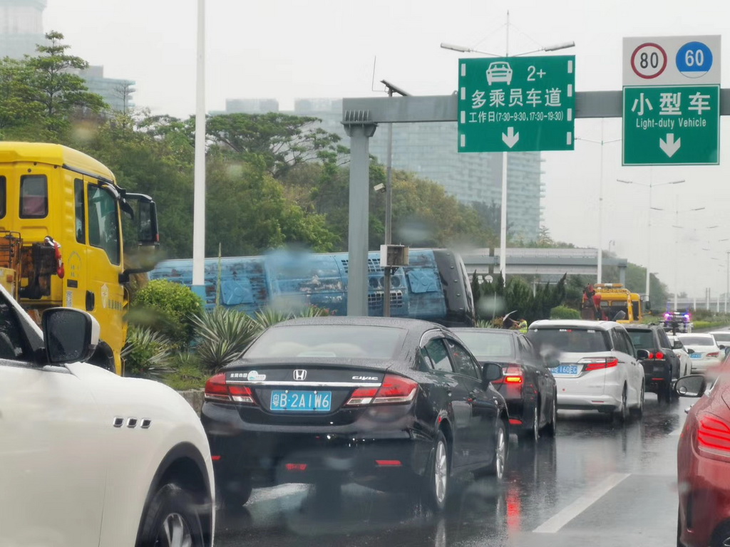 剛剛,濱海大道沙河西路 一大巴車隔離帶上側(cè)翻