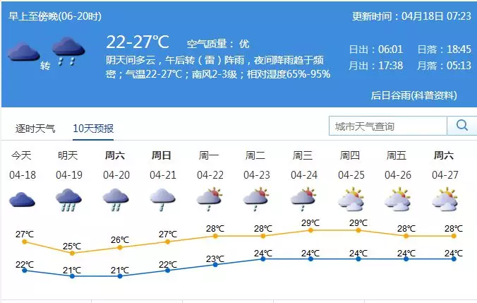 據(jù)深圳天氣,18-20日深圳將迎來新一輪暴雨過程:18日陰天轉(zhuǎn)小到中雨局部大雨伴有短時(shí)雷暴,氣溫22-27℃,19-20日有中到大雨局部暴雨并伴有雷暴和短時(shí)大風(fēng);21日降雨減弱;22-23日有短時(shí)陣雨,部分時(shí)間可見陽光。