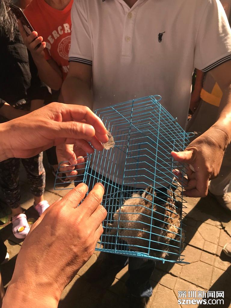 小區(qū)保安先把小貓頭鷹裝進籠子,等待動保所的工作人員到來。