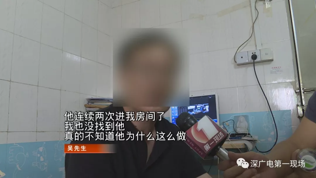 被驚醒的吳先生發(fā)現(xiàn)后,男子在7點19分離開吳先生房間。看到這兩段監(jiān)控,吳先生有點后怕。