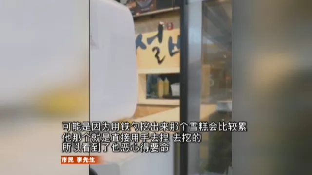 然后他透過窗口看見店員正在制作一個(gè)個(gè)抹茶雪球,只見店員一只手拿模具挖出抹茶,另一只手將抹茶壓實(shí)、捏出造型,全程并沒有佩戴手套!
