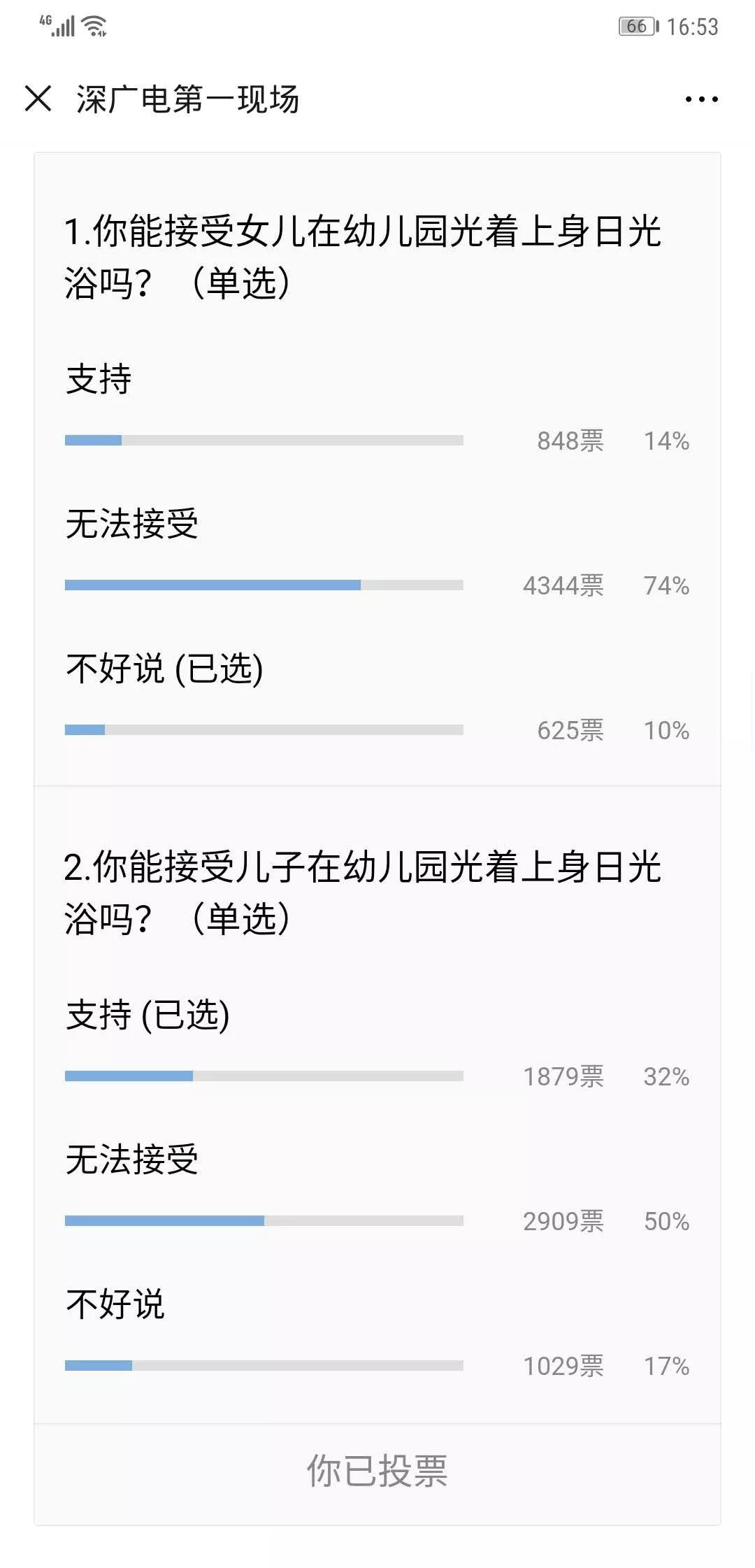節(jié)目播出后,在第一現(xiàn)場微信公眾號上進(jìn)行的話題投票中,有74%的觀眾都認(rèn)為無法接受女兒在幼兒園光著上身日光浴,另外有50%的人認(rèn)為無法接受兒子進(jìn)行同樣的行為。