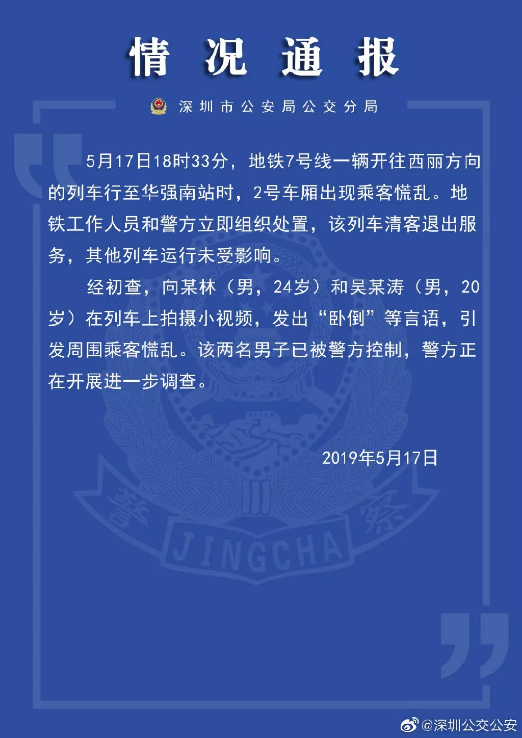 深圳公交公安前日晚間通報(bào)