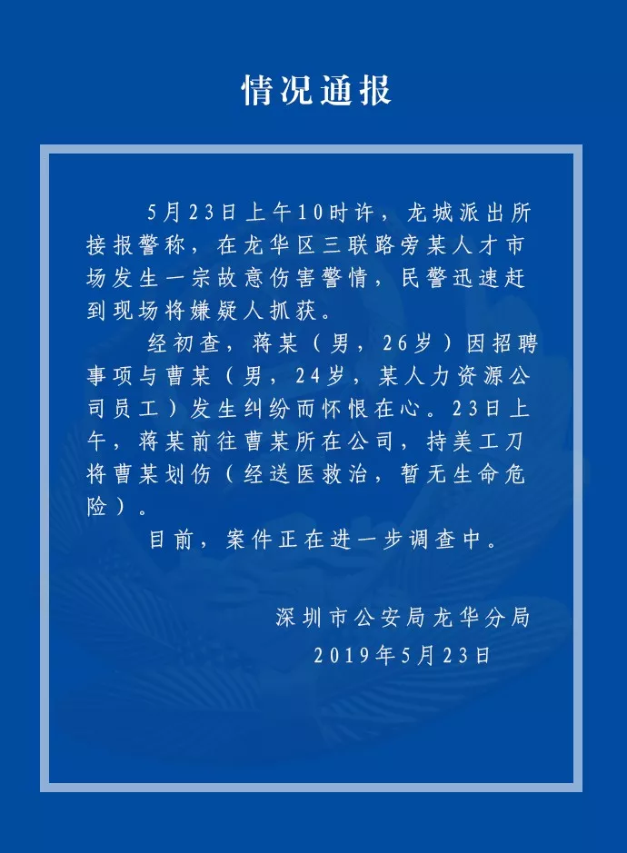 據(jù)警方通報,嫌疑人蔣某因招聘事項與某人力資源公司員工曹某發(fā)生糾紛,懷恨在心。23日上午,蔣某前往曹某所在公司,持美工刀將曹某劃傷。經(jīng)送醫(yī)救治,暫無生命危險,目前案件進一步調(diào)查當(dāng)中。