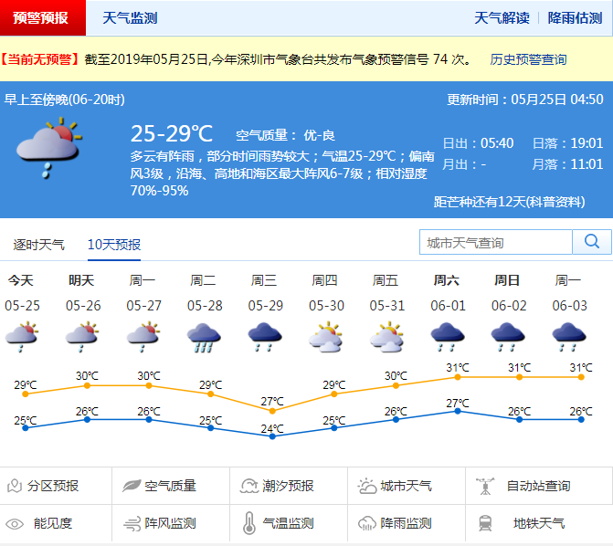 深圳新聞網(wǎng)2019年5月25日訊 5月24日深圳天氣平穩(wěn),全市最高氣溫不到30 ℃,說好要來的雨也"爽約"了,僅僅在光明和寶安灑了一些雨水。接下來深圳天氣如何?預(yù)計未來三天多云為主,局地有短時強降水,市民出行注意攜帶雨具。