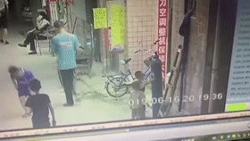可能是出于好奇心,身旁無人看管的他,抱住了店鋪門口佇立的一個氧氣瓶,并嘗試?yán)瓌印?/p>