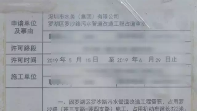 現(xiàn)場(chǎng)的一份施工告知書(shū)顯示,正在施工的這項(xiàng)工程,屬于水務(wù)集團(tuán)羅沙路污水管道改造工程,獲得了占用道路挖掘許可。工程周期從5月15日開(kāi)始到6月29日截止,一共45天。
