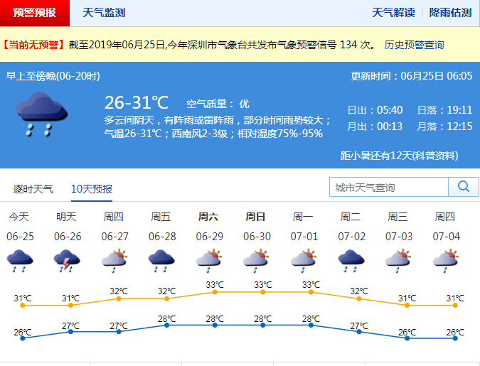 深圳新聞網2019年6月25日訊 昨日,深圳啟動暴雨IV級應急響應,全市普遍出現大雨,局部暴雨,最高氣溫26℃左右,高溫天氣緩解。市氣象臺預測,未來兩天風力清勁,多陣雨,局部大雨。