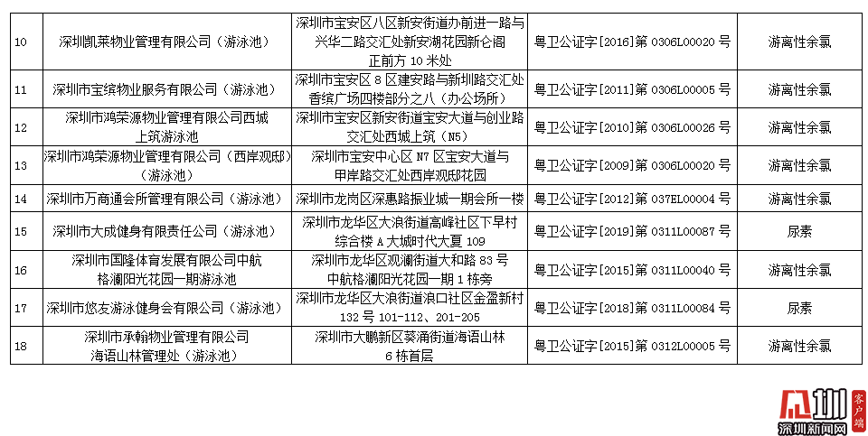 記者獲悉,深圳市夢(mèng)六健身有限公司(游泳池)pH值和游離性余氯指標(biāo)不合格,深圳市百利行物業(yè)發(fā)展有限公司中信紅樹灣花城物業(yè)管理處(游泳池)、深圳市大成健身有限責(zé)任公司(游泳池)、深圳市悠友游泳健身會(huì)有限公司(游泳池)尿素指標(biāo)不合格,加福投資(深圳)有限公司福朋喜來登酒店(游泳池)、深圳市蓮花物業(yè)管理有限公司彩田村游泳場(chǎng)、深圳大中華國(guó)際酒店管理有限公司大中華希爾頓酒店(游泳池)、深圳市京基物業(yè)管理有限公司濱河時(shí)代物業(yè)服務(wù)中心(游泳池)、深圳新都酒店股份有限公司新都酒店(游泳池)、深圳陽光酒店(游泳池)、深圳市金地物業(yè)管理有限公司翠盈嘉園管理處(游泳池)、深圳凱萊物業(yè)管理有限公司(游泳池)、深圳市寶繽物業(yè)服務(wù)有限公司(游泳池)、深圳市鴻榮源物業(yè)管理有限公司西城上筑游泳池、深圳市鴻榮源物業(yè)管理有限公司(西岸觀?。ㄓ斡境兀⑸钲谑腥f商通會(huì)所管理有限公司(游泳池)、深圳市國(guó)隆體育發(fā)展有限公司中航格瀾陽光花園一期游泳池、深圳市承翰物業(yè)管理有限公司海語山林管理處(游泳池)游離性余氯指標(biāo)不合格。衛(wèi)生監(jiān)督部門已責(zé)令抽檢結(jié)果不合格單位立即整改,并跟蹤整改情況。