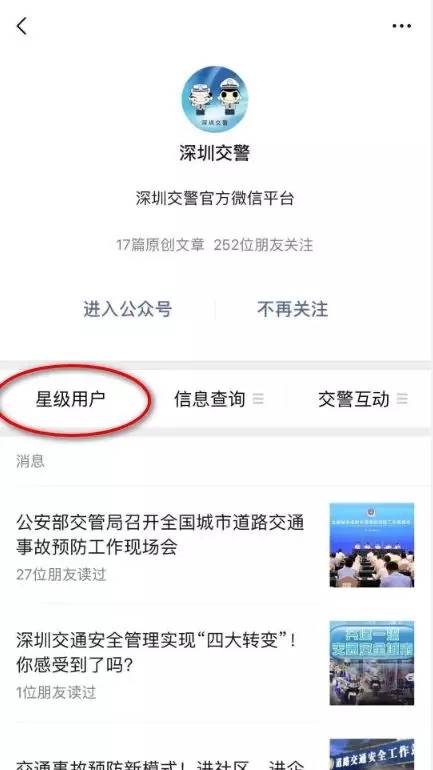 01 車主本人/代辦人關注【深圳交警】微信公眾號,點擊進入【星級用戶】,注冊登錄星級用戶后,在頁面選擇【車管規(guī)費繳納】。