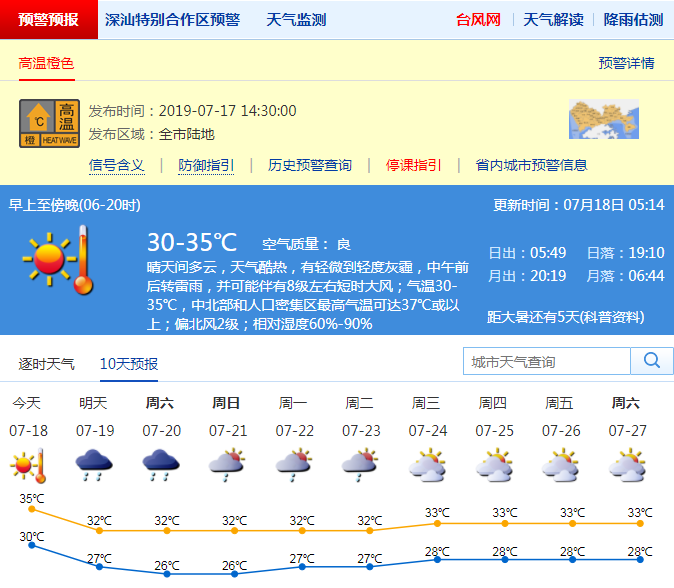 市氣象臺(tái)提醒:今日高溫酷熱天氣持續(xù),需注意防暑防曬,全市高溫橙色預(yù)警信號生效中,用人單位應(yīng)視情況于12時(shí)至15時(shí)停止戶外或高溫作業(yè),縮短連續(xù)作業(yè)時(shí)間;可能出現(xiàn)雷雨大風(fēng)等強(qiáng)對流天氣;受“丹娜絲”影響,18日至19日廣東東部海面及南海東北部海面風(fēng)力較大。
