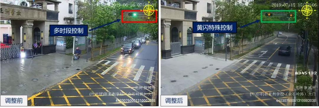 龍崗怡翠/新亞洲學(xué)校路口行人過街需求主要集中于上下學(xué)期間,近期暑期開始,行人過街需求小,路口調(diào)整至全天黃閃控制模式,以提高機(jī)動車通行效率。