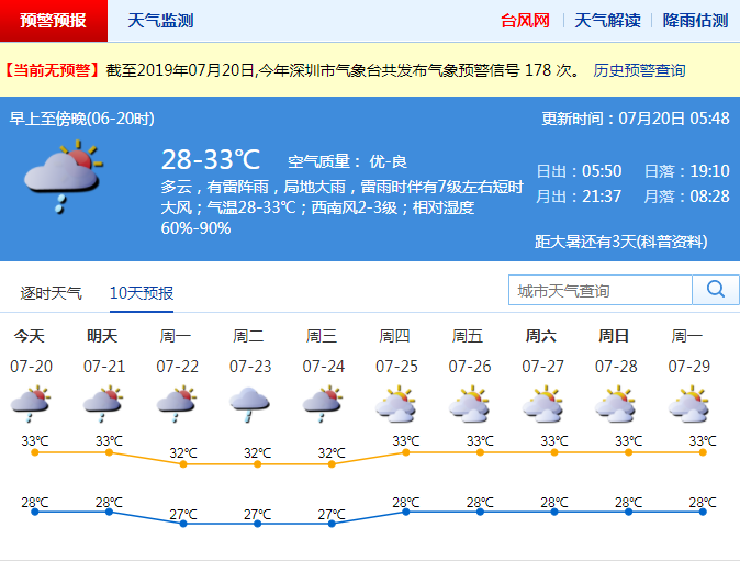 深圳新聞網(wǎng)2019年7月20日訊 昨日午后,我市出現(xiàn)中到大雨局部暴雨,并出現(xiàn)8-9級(jí)的短時(shí)大風(fēng)。深圳市氣象臺(tái)先后發(fā)布雷電、大風(fēng)藍(lán)色、暴雨黃色和分區(qū)暴雨橙色預(yù)警信號(hào)。這場(chǎng)雨帶來(lái)的降溫效果明顯,持續(xù)多日的高溫緩解,預(yù)警解除。