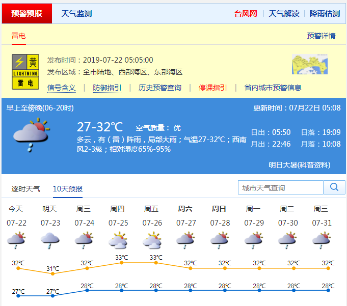 深圳新聞網(wǎng)2019年7月22日訊 炎熱與局地陣雨是近日深圳天氣的主題。據(jù)市氣象局預(yù)計(jì),未來兩天我市依然陽(yáng)光陣雨相伴,部分時(shí)間雨勢(shì)較大。其中,22日多云,有(雷)陣雨,局部大雨;27-32℃;西南風(fēng)2-3級(jí);濕度65%-95%。預(yù)計(jì)23-24日有(雷)陣雨,局部大雨;25-26日天氣炎熱,有局地短時(shí)陣雨。