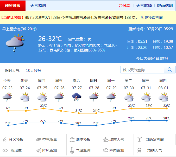 深圳新聞網(wǎng)2019年7月23日訊 市氣象局預(yù)計(jì)深圳23日多云為主,有(雷)陣雨,部分時間雨勢較大,局部地區(qū)雨量可達(dá)中到大雨量級;氣溫27-32℃,中午前后體感略顯悶熱;西南風(fēng)2-3級;相對濕度65%-95%。24-26日轉(zhuǎn)炎熱天氣,午后易激發(fā)熱對流性降雨,最高氣溫33-35℃;27-28日降雨增多,部分時間雨勢較大。